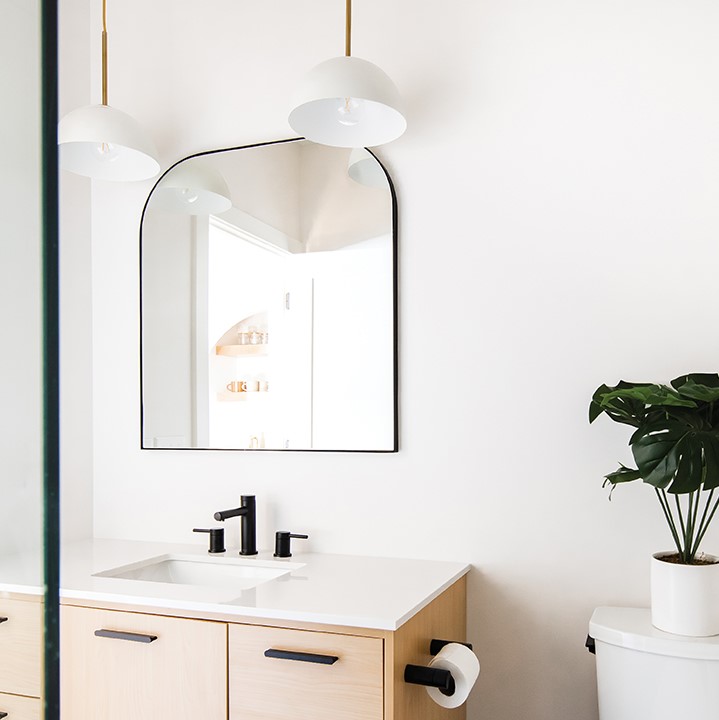 To begin, Willaby created a mood board, combining a black and white color palette with light wood tones. The mood board helped Willaby and her clients refine the design and select materials for tile, plumbing and lighting that complemented the color scheme and feel. They ultimately chose black plumbing fixtures mixed with gold accents and earthy tones.