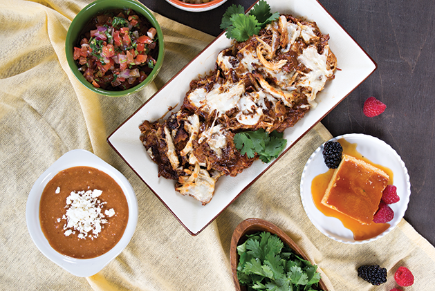 Simple and mild, Pollo con Adobo is a layered, casserole-style dish prepared with shredded chicken breast and house-made adobo sauce. All of the sauces are made from scratch—Rayas does not use any thickeners, just vegetables. “The sauce ends up being a bit sweet and tart, and with cream and cheese and chicken it makes for a very tasty meal,” Rayas says. A medium Pollo con Adobo has four generous servings. Rayas recommends